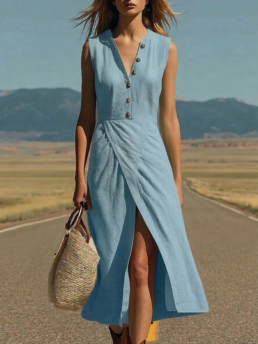 Cotton Blend Plain V Neck Button Sleeveless A-Line Summer Going Out Casual Dress