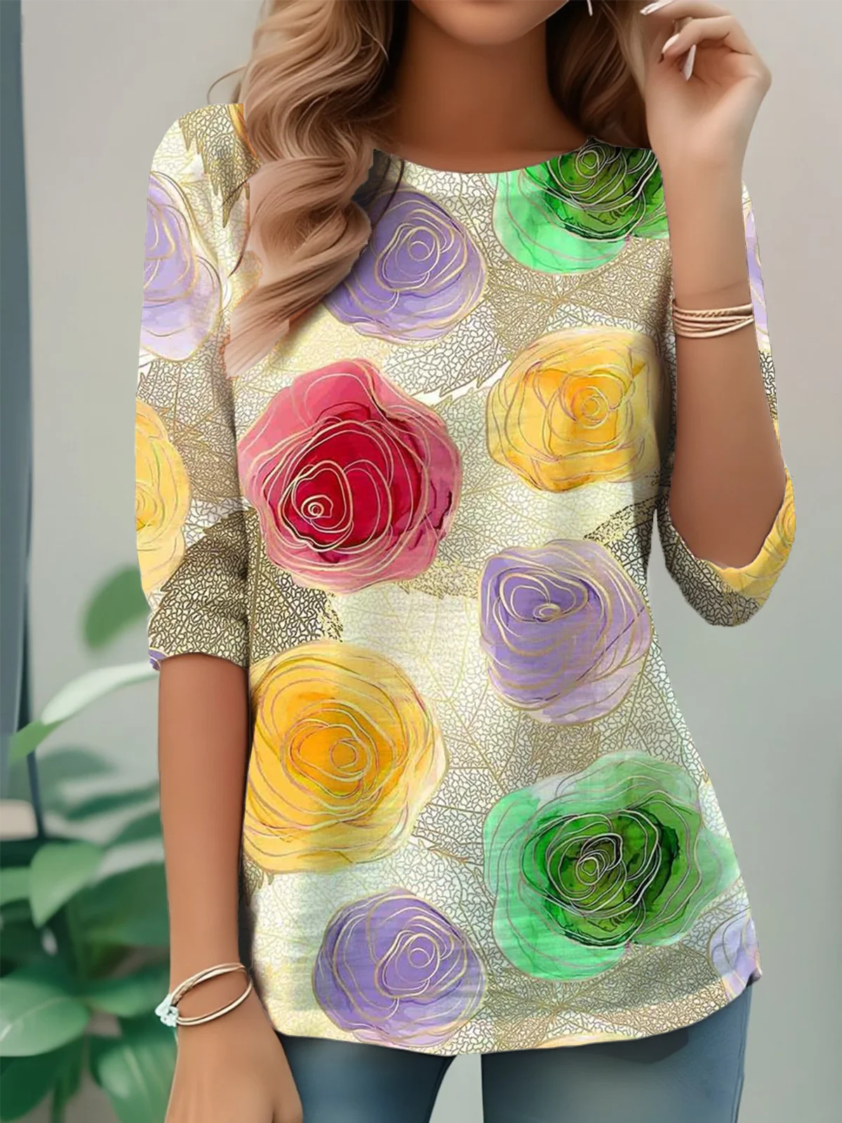 Women's Floral Pattern T-Shirt Elegant Retro Round Neck Long Sleeve Top For Daily Spring And Autumn