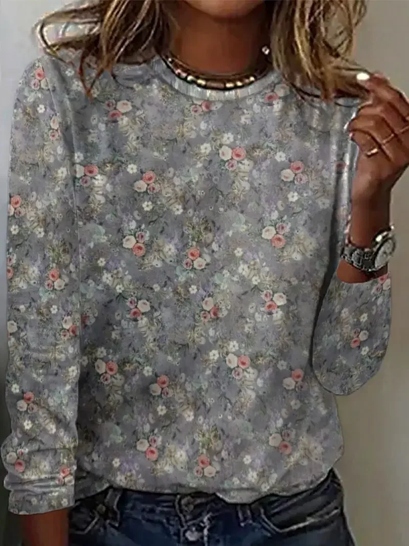 Women's Long Sleeve T-shirt Spring/Fall Gray Floral Printing Jersey Crew Neck Daily Going Out Casual Top