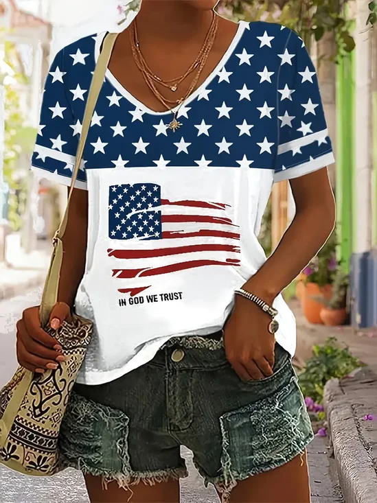Women's July 4th Independence Day Flag Print V-Neck Short Sleeve T-Shirt