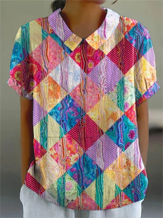 Vintage Stand Collar Multicolor Block Loose Shirt