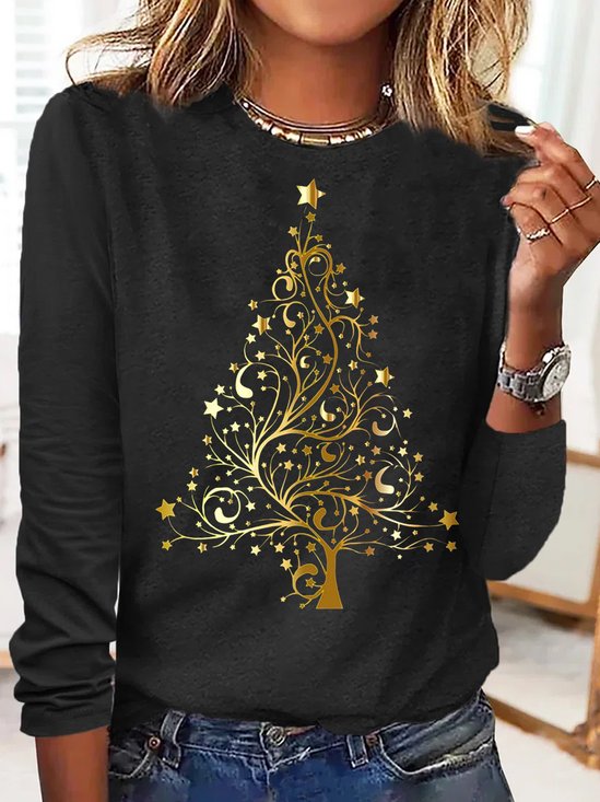 Women's Christmas Tree Cotton-Blend Crew Neck Casual Long Sleeve Shirt