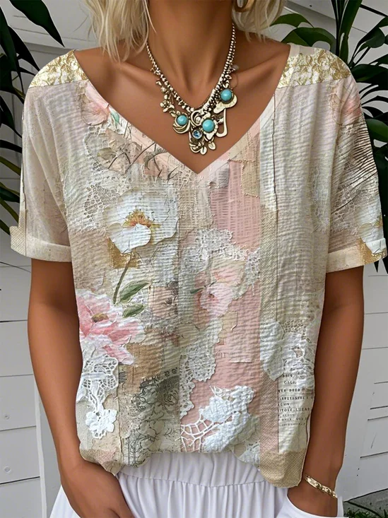 Women's Long Sleeve T-shirt Spring/Fall Pink Floral Printing Jersey V Neck Daily Going Out Casual Top