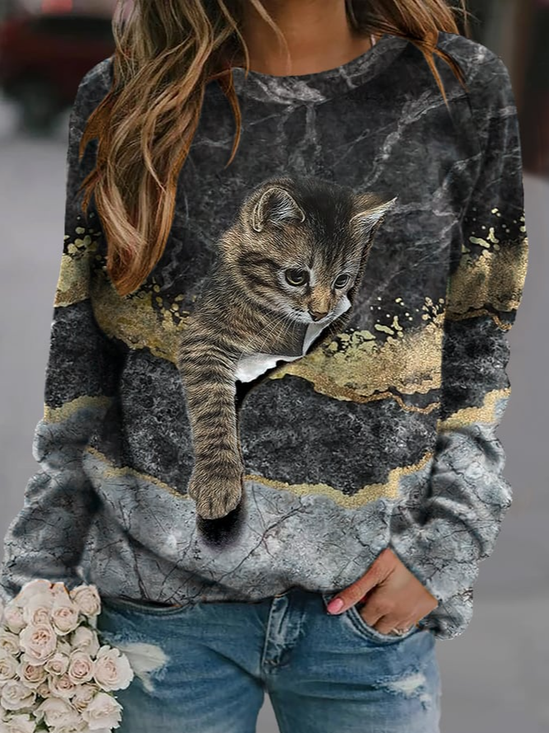 Cat Print Daily Heavyweight Crew Neck Casual Loose Long Sleeve Sweatshirt