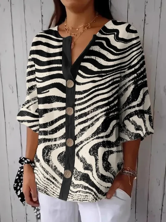 Vintage Hand Painted Casual Linen V Neck Shirt