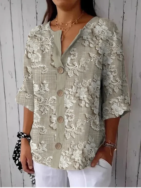 Elegant Botanical Pattern Linen Blend V Neck Shirt