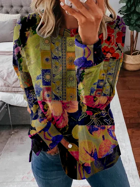 Women's Floral Print Casual Zipper Neck Long Sleeve Sweatshirt