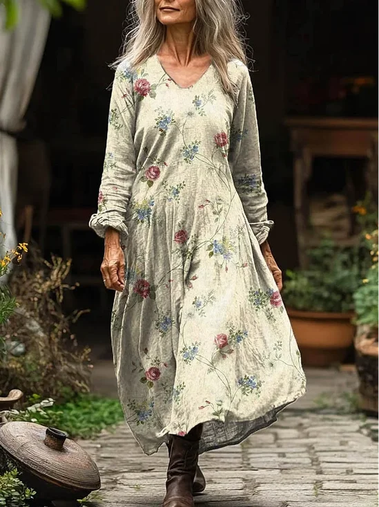 Floral V-neck Daily Loose Jersey Long Sleeve Dress