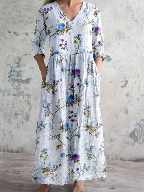 Floral V-neck Daily Loose Jersey Long Sleeve Dress