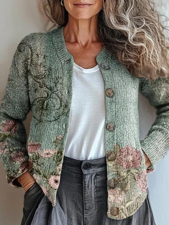 Women's Floral Pattern Art Print Button Cardigan Sweater