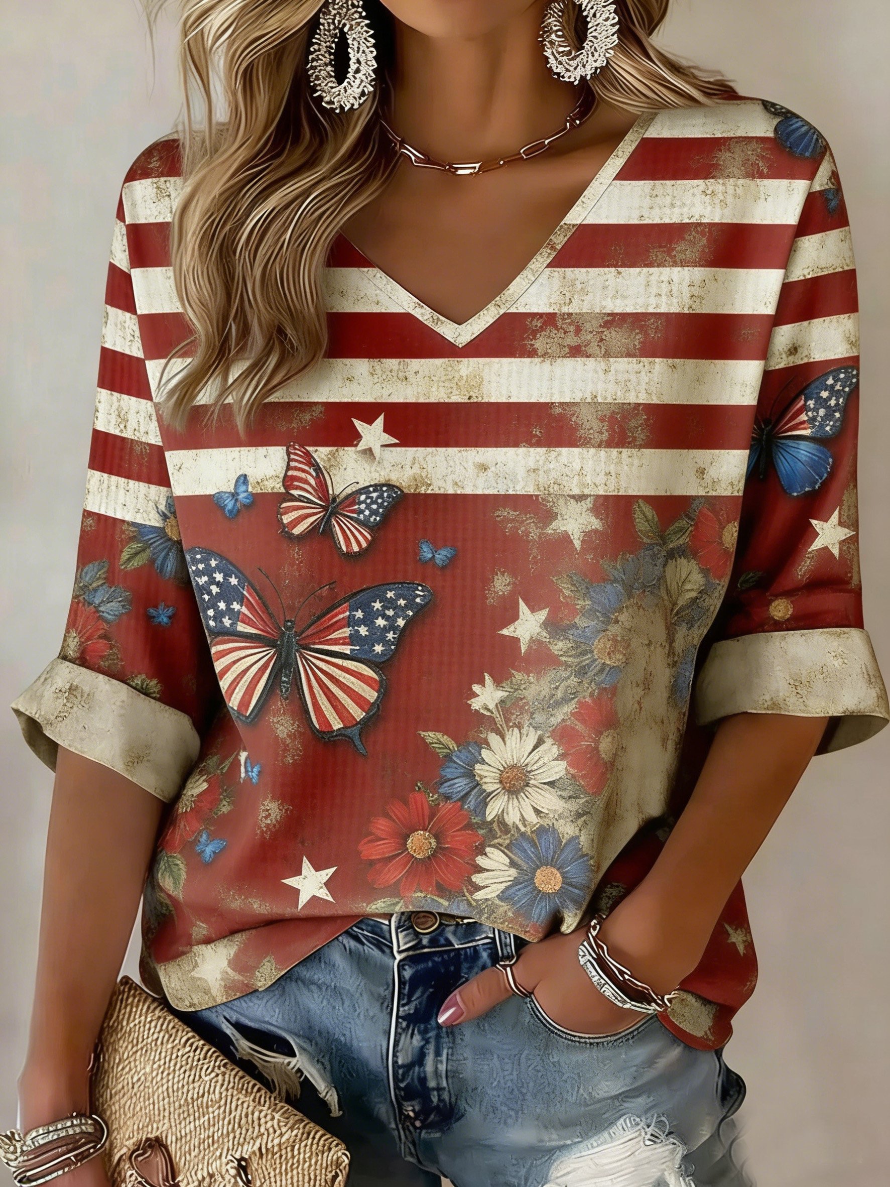 3D Printing V Neck America Flag Floral 250th Anniversary Butterfly Spring Summer Casual T-Shirt