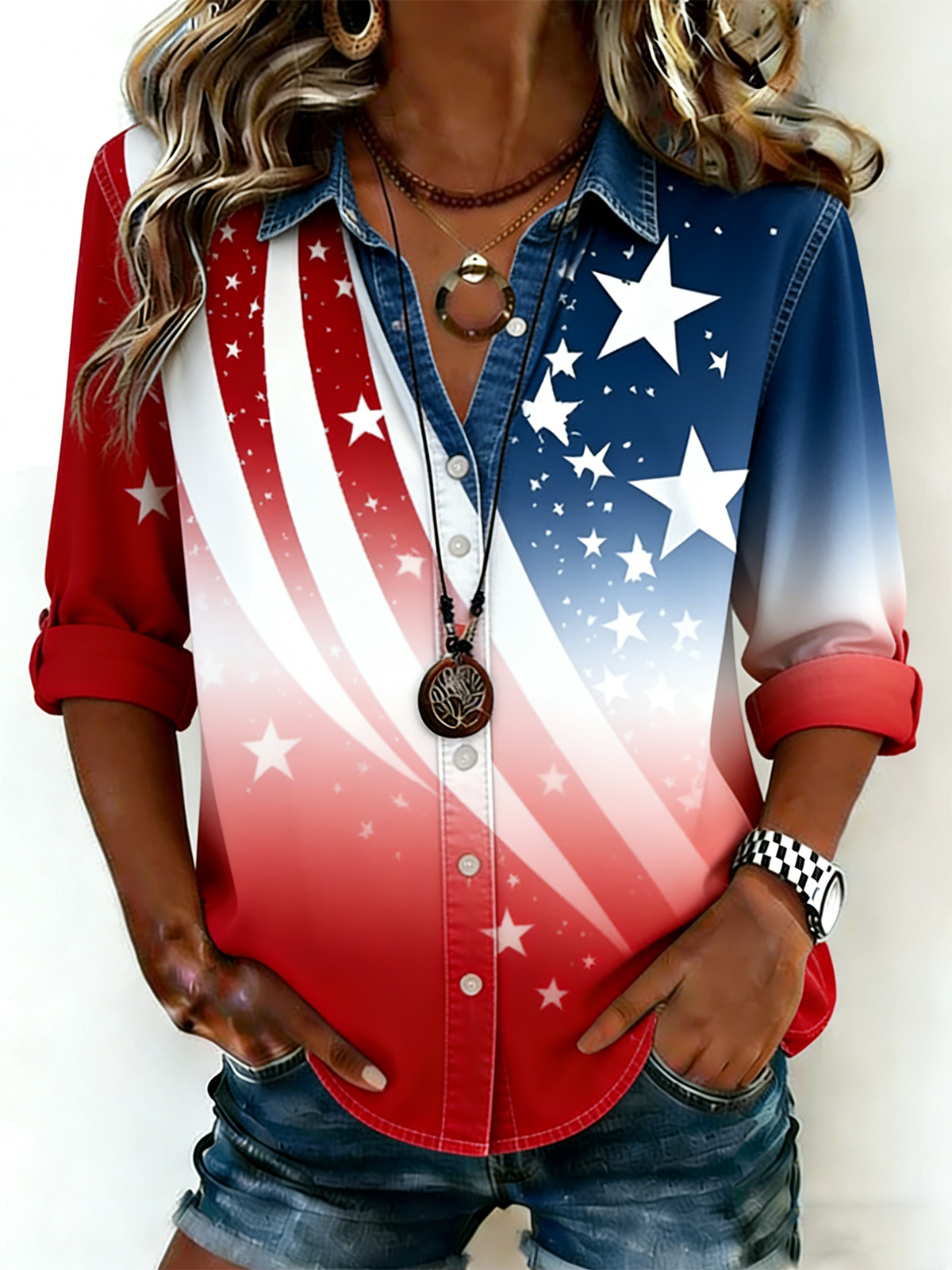 Pattern:Gradient Pattern,America Flag,Geometric,Faux Denim Print Graphic