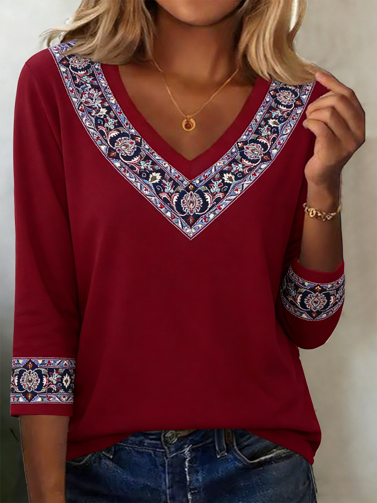 Cotton-Blend Casual V Neck T-Shirt