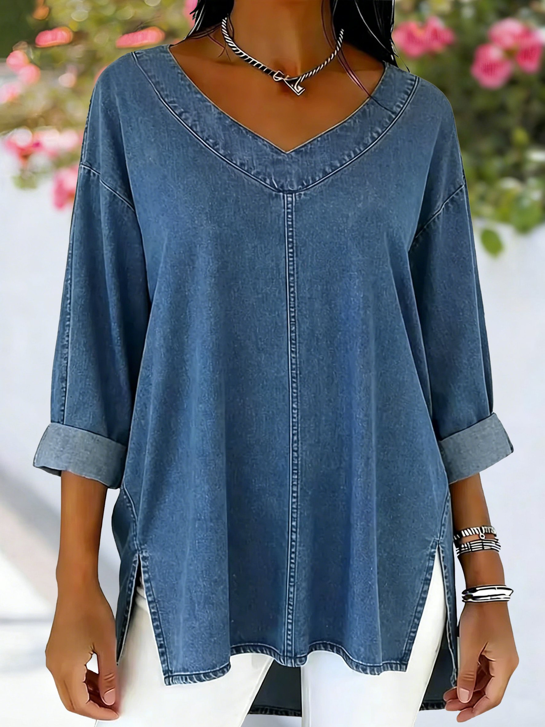 Denim Look/Denim Effect V Neck Ruffle Cuff Spring Summer Casual Top