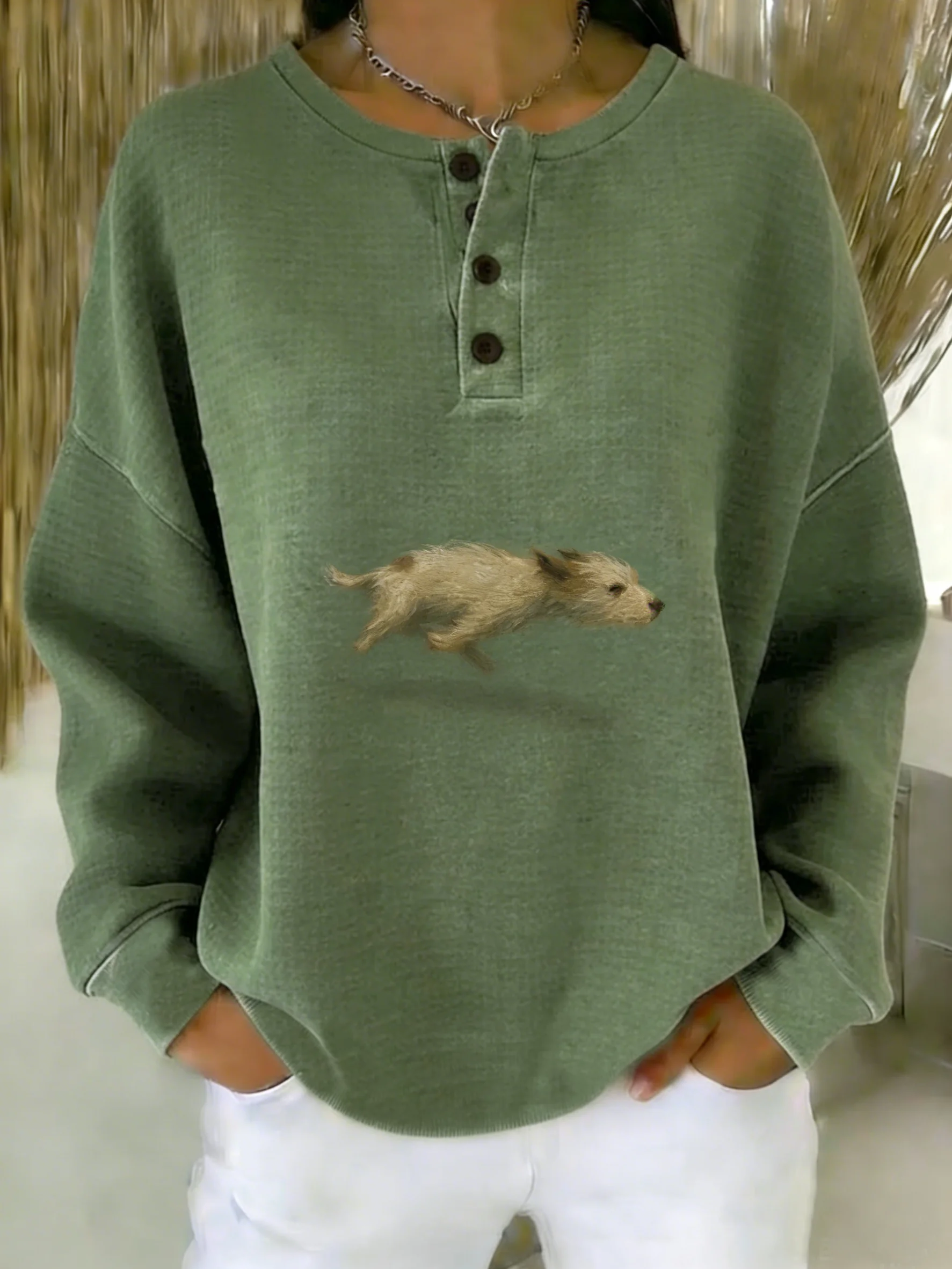 Dog Loose Print Button-Up Casual Waffle Knit Sweatshirt