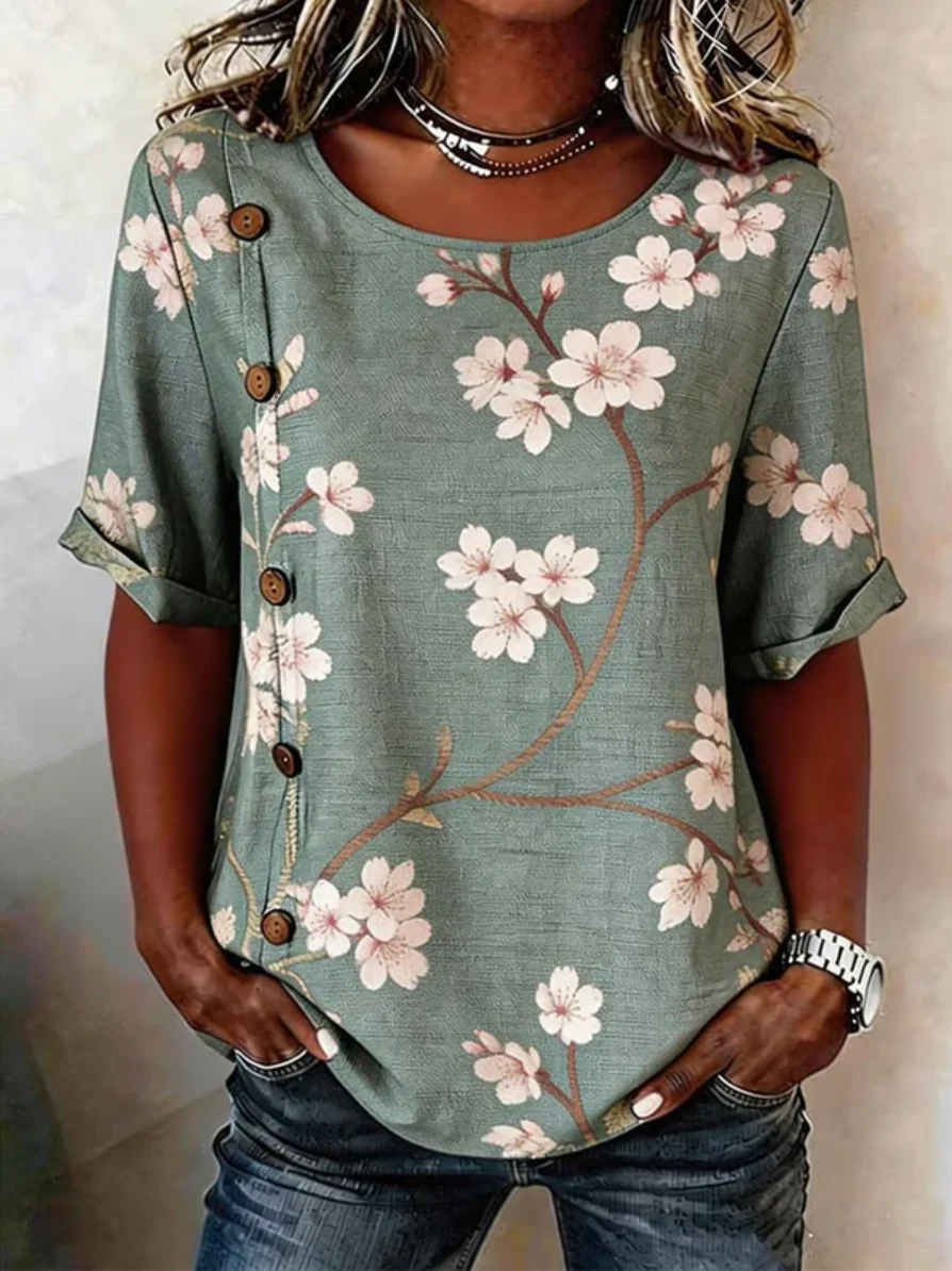 Floral Loose Linen Blend Elegant Shirt