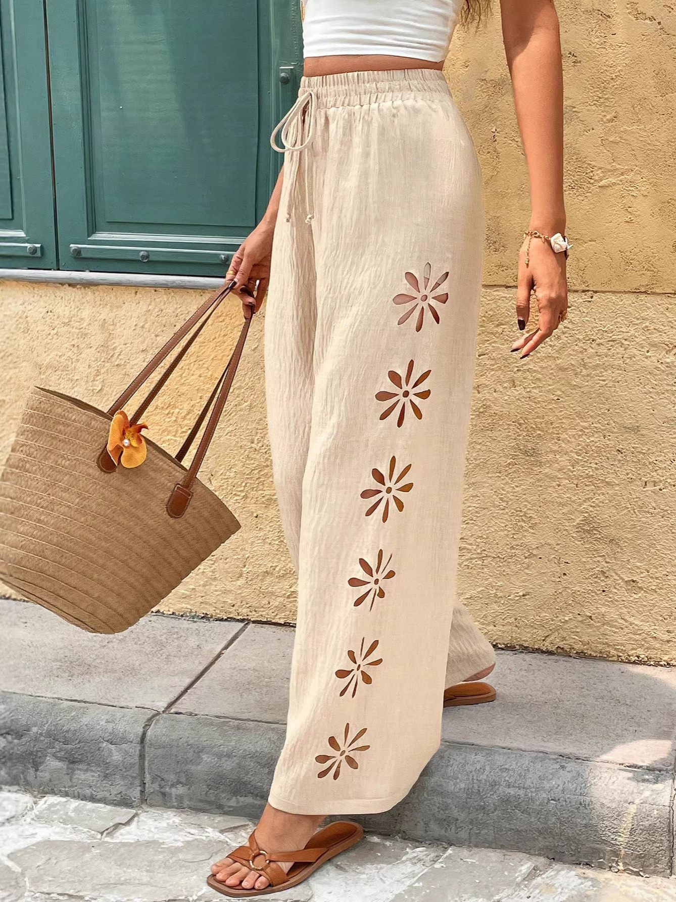 Plain High Waist Side Embroidered Design Casual Loose Boho Wide Leg Pants