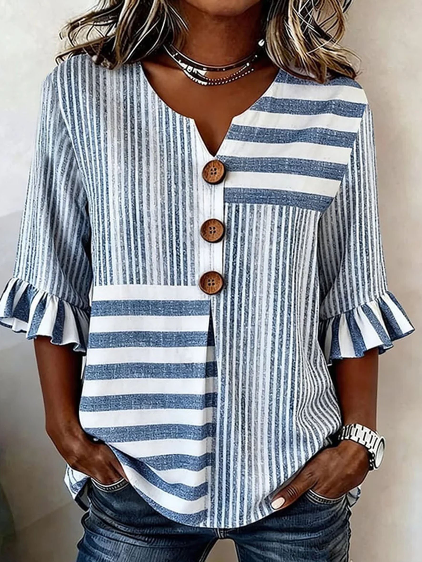 Women's Blue Striped Printed Half Sleeve Ruffle Cuff Blouse Summer V Neck Button Daily Going Out Vintage Top