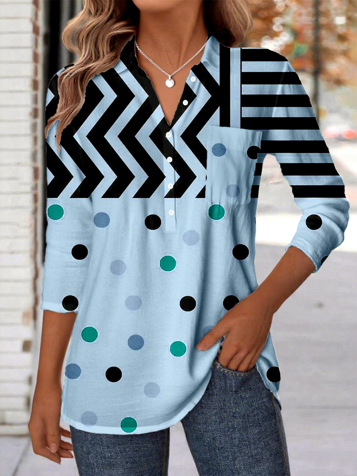 Women's Geometric Polka Dot Pattern Patch Pocket Long Sleeve Shirt Regular Top