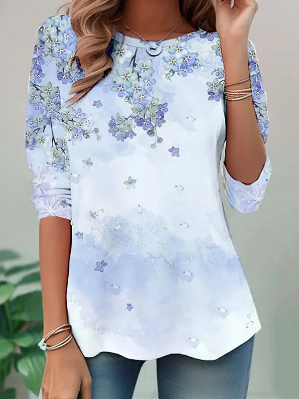 Women's Long Sleeve T-shirt Spring/Fall Blue Floral Printing Jersey Crew Neck Daily Going Out Casual Top