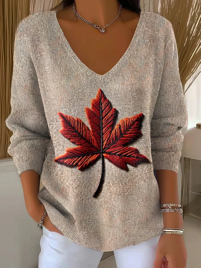 Women's Long Sleeve T-shirt Spring/Fall Oatmeal Maple Leaf Printing V Neck Daily Going Out Casual Top