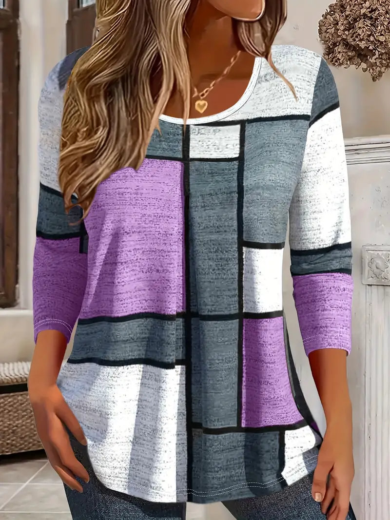 Women's Long Sleeve T-shirt Spring/Fall Purple Plaid Printing Jersey Crew Neck Daily Going Out Casual Top