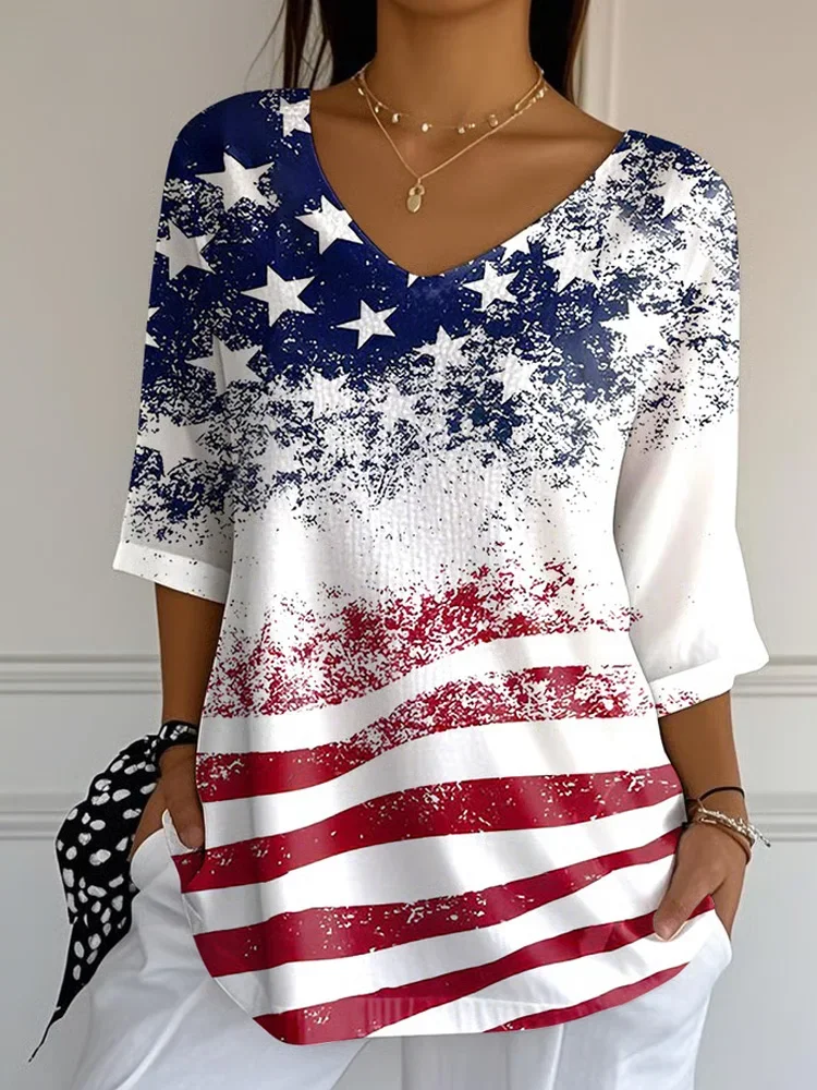 Women's Three Quarter Sleeve T-shirt Spring/Fall White America Flag Printing V Neck Daily Going Out Casual Top
